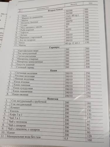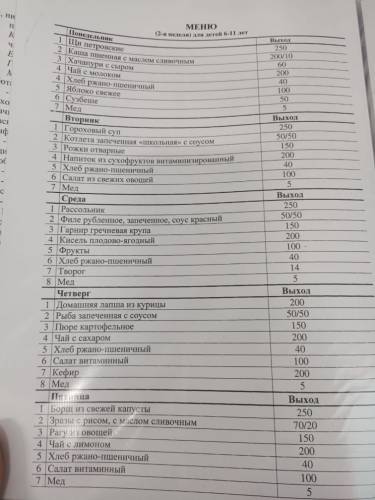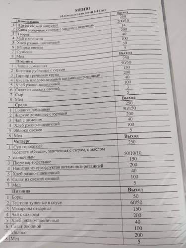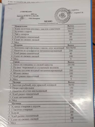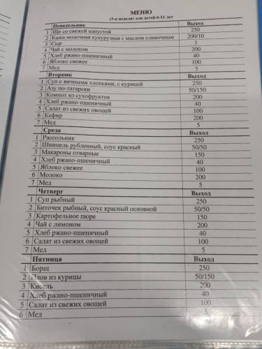 Меню школьной столовой для учащихся.